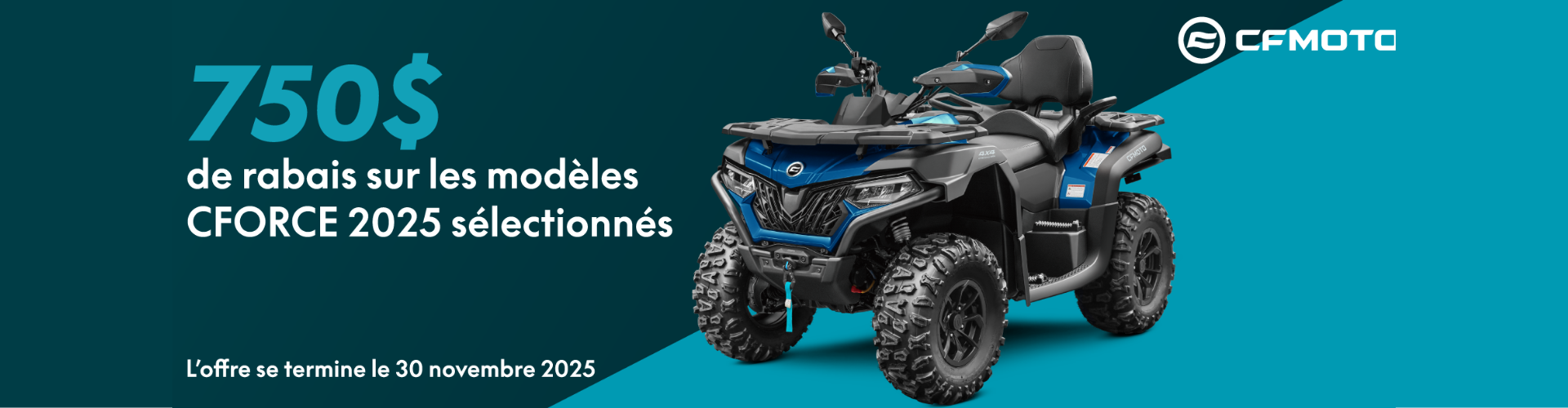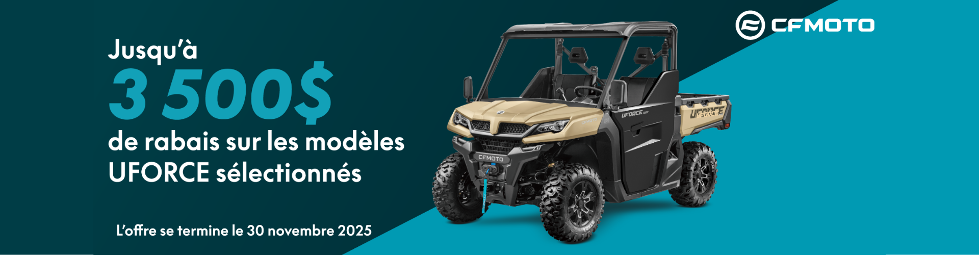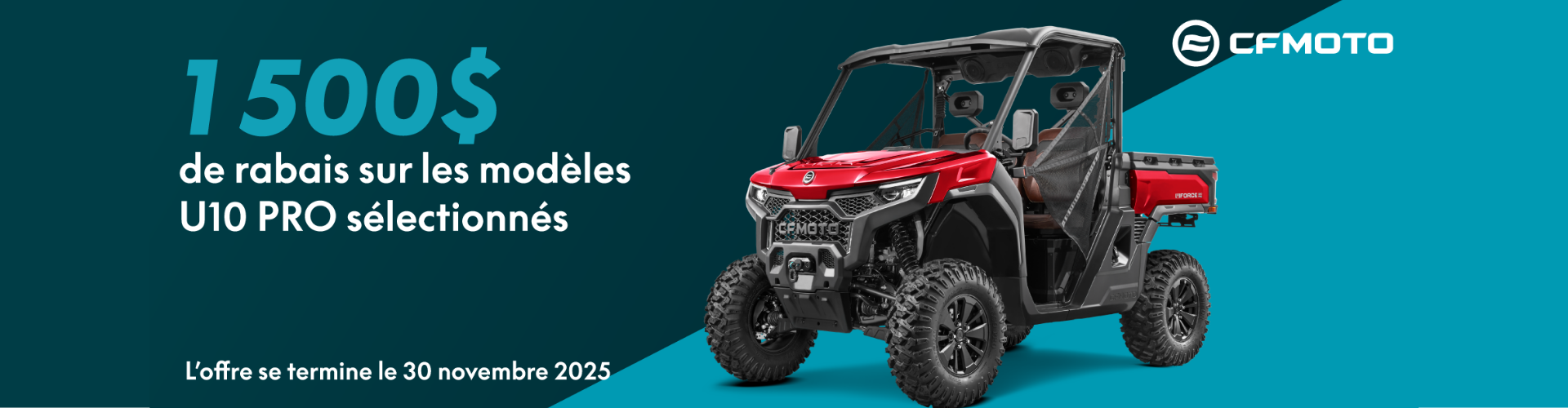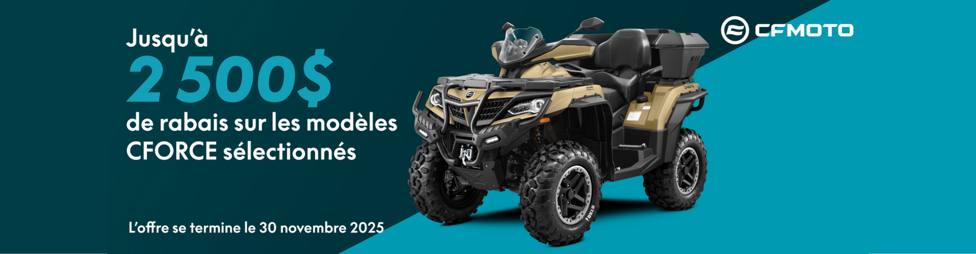 CFMoto fabrique et conçoit des VTT, cote-à-cote et utilitaires compétitifs, fiables et adaptés aux besoins de nos clients québécois. Découvrez leur gamme complète. Vous resterez surpris de la qualité de leur motorisation et de l’évolution de leurs produits!